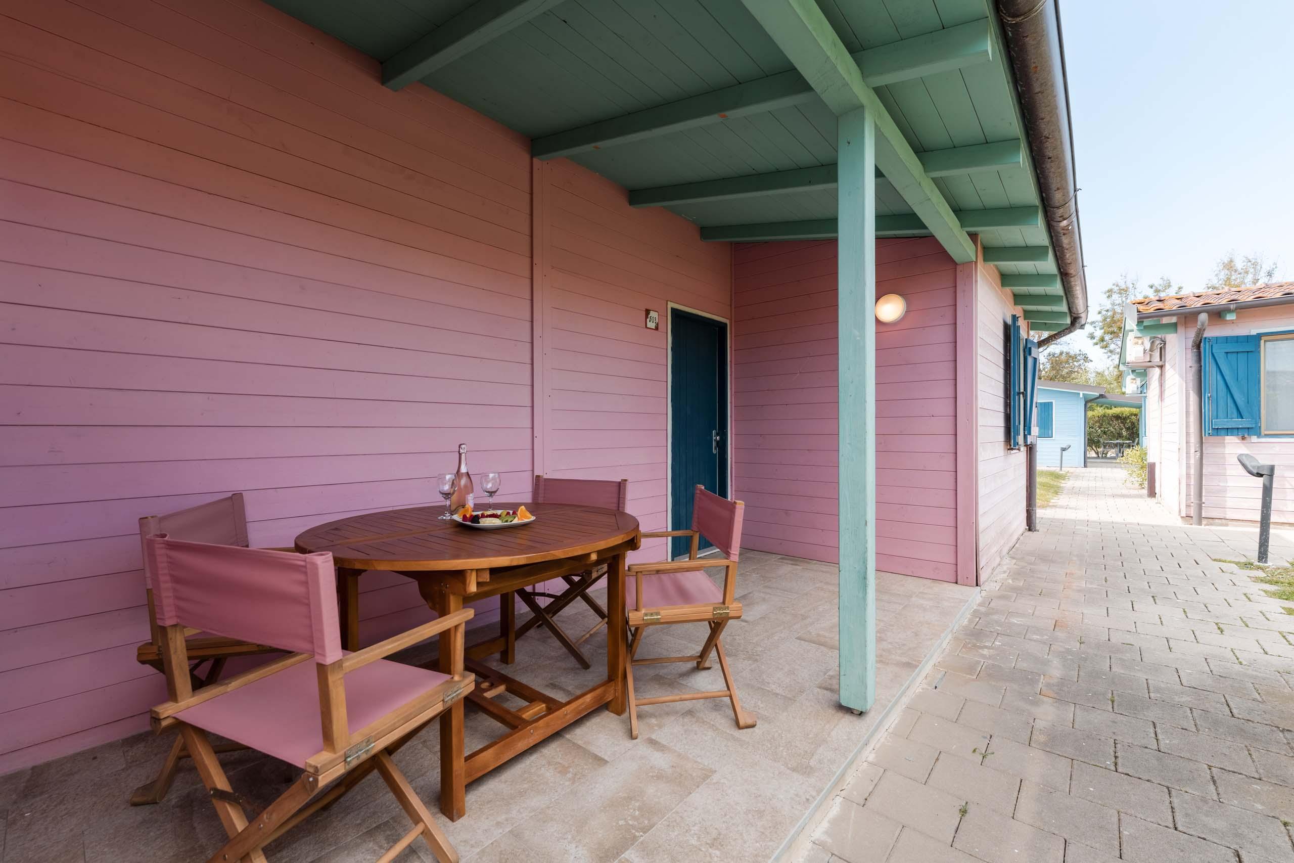 Benvenuti al Coral Chalet! Aprite la porta in legno blu del vostro ampio e moderno chalet trilocale e sentitevi a casa. Qui c’è spazio per tutta la famiglia: la cucina è attrezzata e ha un angolo soggiorno moderno e funzionale con divano letto, ci sono una camera matrimoniale e una camera con letto a castello (materasso: 80x185 cm) e ben due bagni. Cos’altro?Lo chalet dispone di cassaforte, aria condizionata, TV digitale e gli animali sono ammessi. All’esterno troverete un’ampia veranda privata arredata, il posto ideale per rilassarsi dopo una giornata al mare!